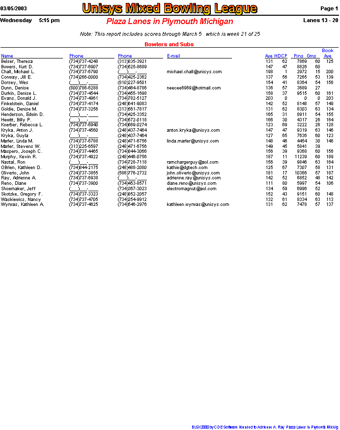 Email addresses for all bowlers in our league are included in this box below. Copy this block of text to the To: line of your mail message. Note: Some email programs may not recognize the semi-colon ( ; ) for separating email addresses. Some, like Yahoo mail, need a comma as a separator instead. Change it if you need to once you've copied this text into your own mail message.