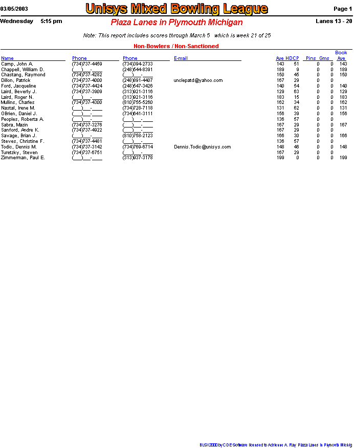 View list of non-bowlers. These people either bowled with us in a previous season, or have at one time said they were interested in being a sub. None have bowled this season and would need to re-sanction in order to bowl. |