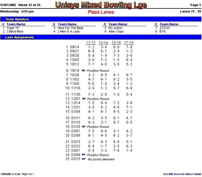 Note: These will also be the lane assignments for the Week 26 single elimination tournament (fun night).