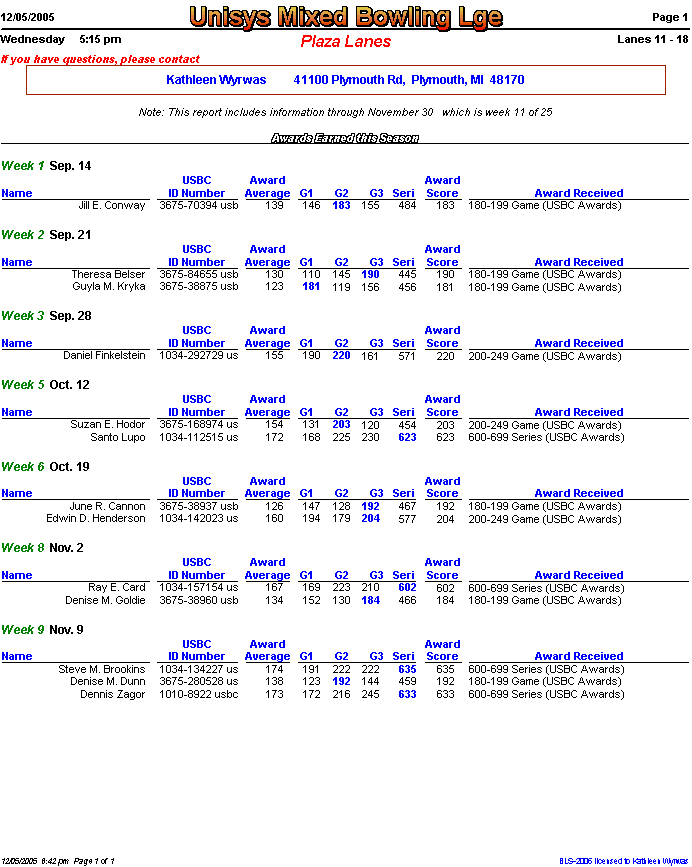 There was a bit of confusion last night over whether or not we bowl on December 21. Upon checking our contract with Plaza Lanes, this date is NOT listed as an off week (unlike many previous years). But this is not the case this year. Yes we are bowling December 21. Other pages on this site will be updated accordingly.USBC Achievement Awards