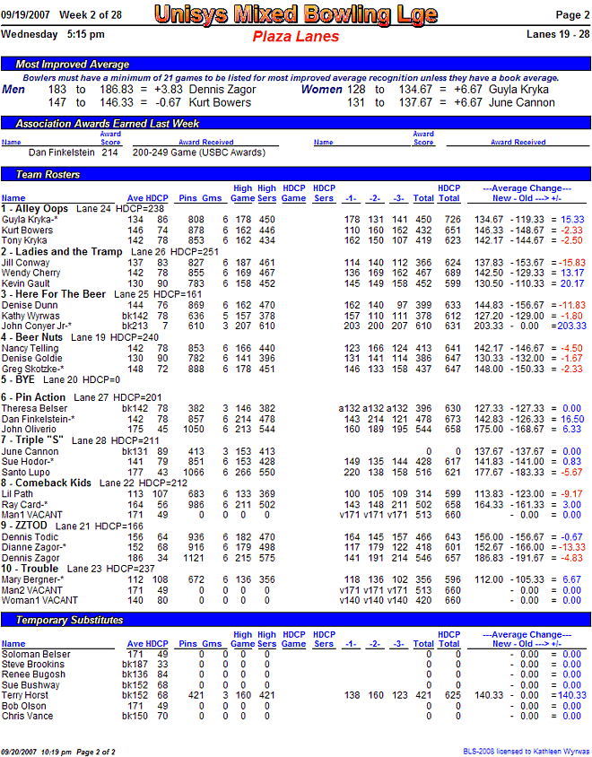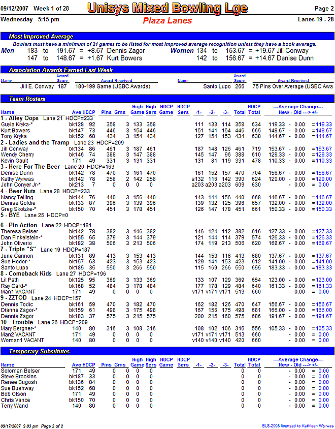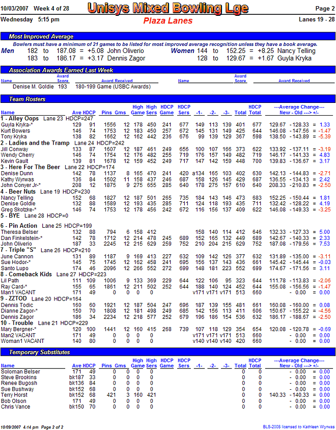 Score results report, all teams (PDF)Alternately, try out this week's standings sheet as a PDF file: Click here.